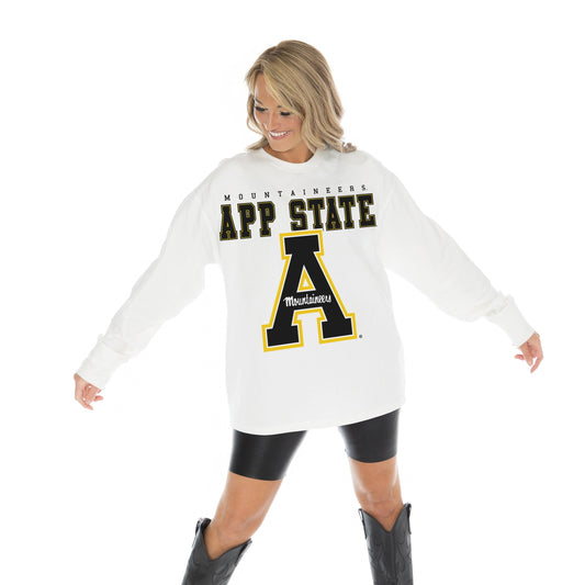 APPALACHIAN STATE MOUNTAINEERS BIG GOALS OVERSIZED MIDWEIGHT LONG SLEEVE TEE WITH RIBBED NECKLINE AND CUFFS