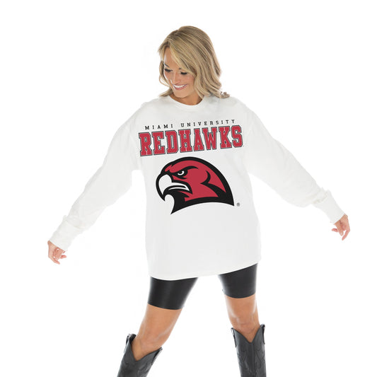 MIAMI OF OHIO REDHAWKS BIG GOALS OVERSIZED MIDWEIGHT LONG SLEEVE TEE WITH RIBBED NECKLINE AND CUFFS