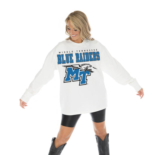 MIDDLE TENNESSEE STATE BLUE RAIDERS BIG GOALS OVERSIZED MIDWEIGHT LONG SLEEVE TEE WITH RIBBED NECKLINE AND CUFFS