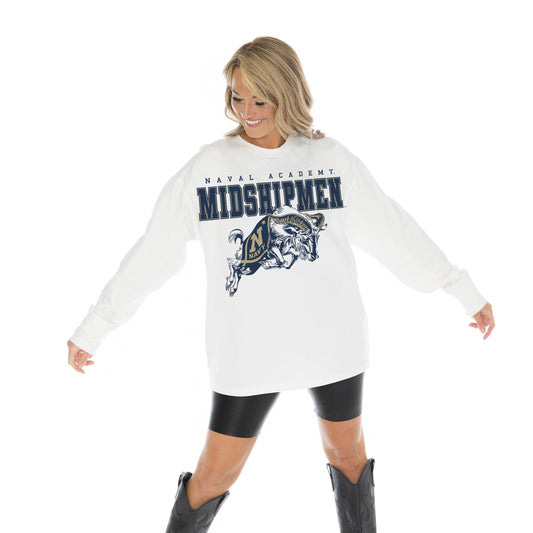 US NAVY MIDSHIPMEN BIG GOALS OVERSIZED MIDWEIGHT LONG SLEEVE TEE WITH RIBBED NECKLINE AND CUFFS