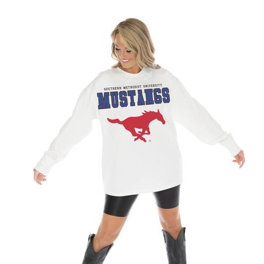 SMU MUSTANGS BIG GOALS OVERSIZED MIDWEIGHT LONG SLEEVE TEE WITH RIBBED NECKLINE AND CUFFS