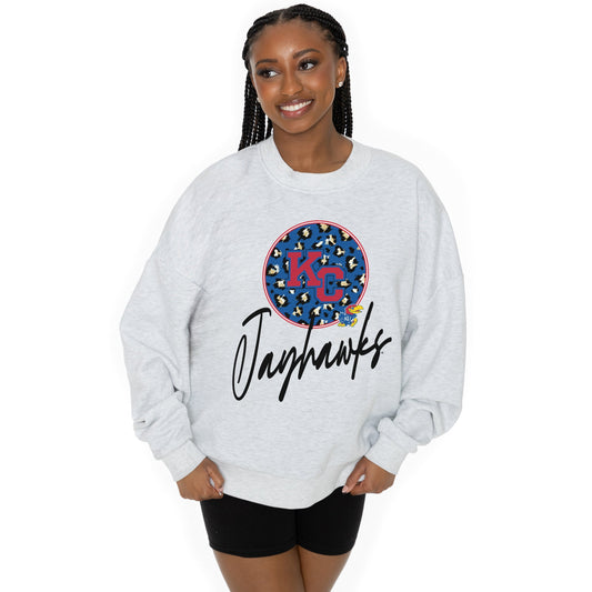 KANSAS JAYHAWKS GOING WILD LONG SLEEVE UNISEX FIT PREMIUM FLEECE CREWNECK SWEATSHIRT WITH RIBBED KNIT NECKLINE, WRIST, AND WAISTBAND