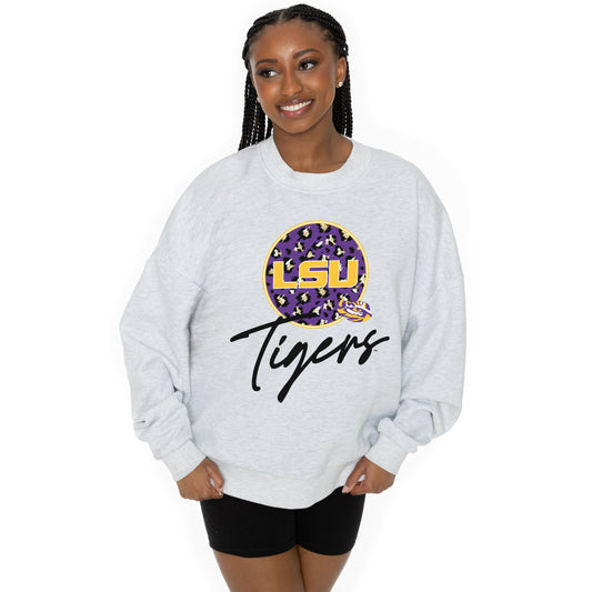 LSU TIGERS GOING WILD LONG SLEEVE UNISEX FIT PREMIUM FLEECE CREWNECK SWEATSHIRT WITH RIBBED KNIT NECKLINE, WRIST, AND WAISTBAND