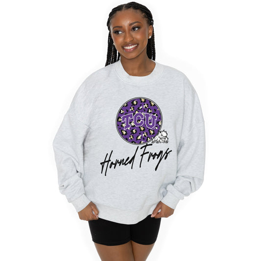 TCU HORNED FROGS GOING WILD LONG SLEEVE UNISEX FIT PREMIUM FLEECE CREWNECK SWEATSHIRT WITH RIBBED KNIT NECKLINE, WRIST, AND WAISTBAND