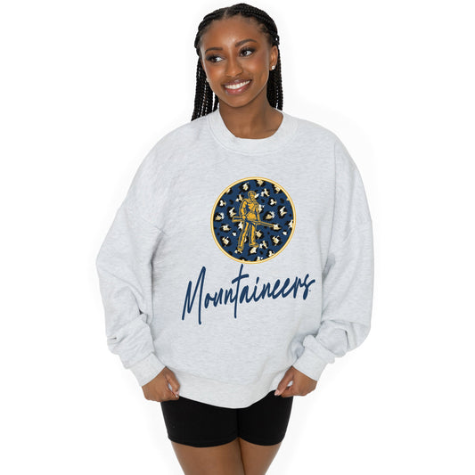 WEST VIRGINIA MOUNTAINEERS GOING WILD LONG SLEEVE UNISEX FIT PREMIUM FLEECE CREWNECK SWEATSHIRT WITH RIBBED KNIT NECKLINE, WRIST, AND WAISTBAND