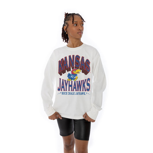 KANSAS JAYHAWKS TIME OUT OVERSIZED MIDWEIGHT LONG SLEEVE TEE WITH RIBBED NECKLINE AND CUFFS