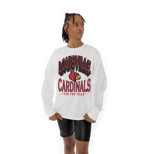 LOUISVILLE CARDINALS TIME OUT OVERSIZED MIDWEIGHT LONG SLEEVE TEE WITH RIBBED NECKLINE AND CUFFS