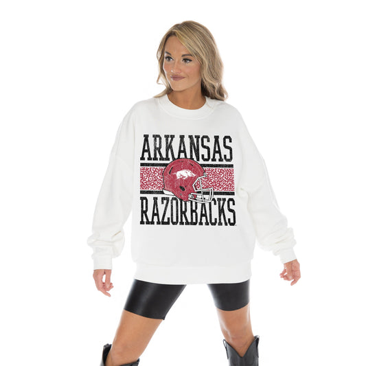 ARKANSAS RAZORBACKS FAIR CATCH LONG SLEEVE UNISEX FIT PREMIUM FLEECE CREWNECK SWEATSHIRT WITH RIBBED KNIT NECKLINE, WRIST, AND WAISTBAND