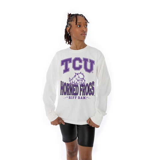 TCU HORNED FROGS TIME OUT OVERSIZED MIDWEIGHT LONG SLEEVE TEE WITH RIBBED NECKLINE AND CUFFS