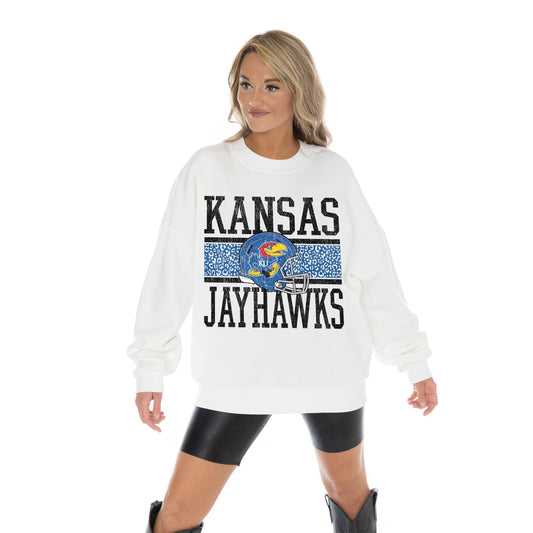 KANSAS JAYHAWKS FAIR CATCH LONG SLEEVE UNISEX FIT PREMIUM FLEECE CREWNECK SWEATSHIRT WITH RIBBED KNIT NECKLINE, WRIST, AND WAISTBAND