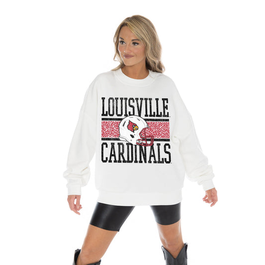 LOUISVILLE CARDINALS FAIR CATCH LONG SLEEVE UNISEX FIT PREMIUM FLEECE CREWNECK SWEATSHIRT WITH RIBBED KNIT NECKLINE, WRIST, AND WAISTBAND