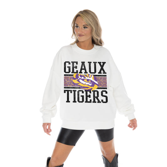LSU TIGERS FAIR CATCH LONG SLEEVE UNISEX FIT PREMIUM FLEECE CREWNECK SWEATSHIRT WITH RIBBED KNIT NECKLINE, WRIST, AND WAISTBAND