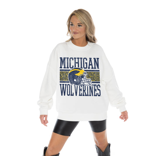 MICHIGAN WOLVERINES FAIR CATCH LONG SLEEVE UNISEX FIT PREMIUM FLEECE CREWNECK SWEATSHIRT WITH RIBBED KNIT NECKLINE, WRIST, AND WAISTBAND