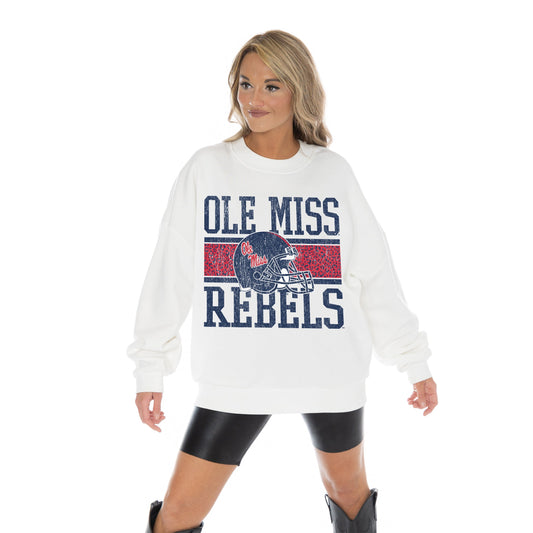 OLE MISS REBELS FAIR CATCH LONG SLEEVE UNISEX FIT PREMIUM FLEECE CREWNECK SWEATSHIRT WITH RIBBED KNIT NECKLINE, WRIST, AND WAISTBAND