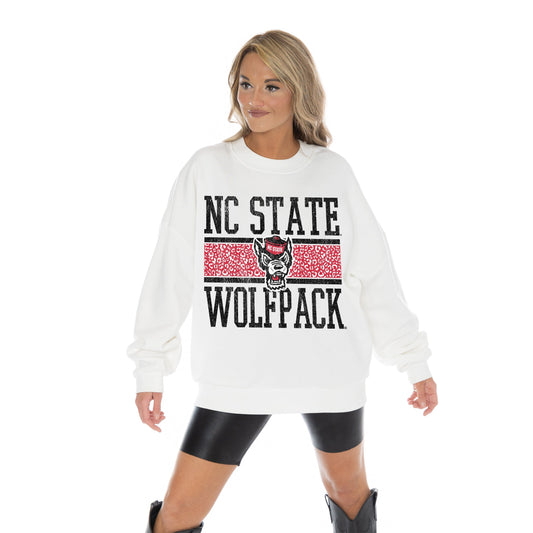 NORTH CAROLINA STATE WOLFPACK FAIR CATCH LONG SLEEVE UNISEX FIT PREMIUM FLEECE CREWNECK SWEATSHIRT WITH RIBBED KNIT NECKLINE, WRIST, AND WAISTBAND