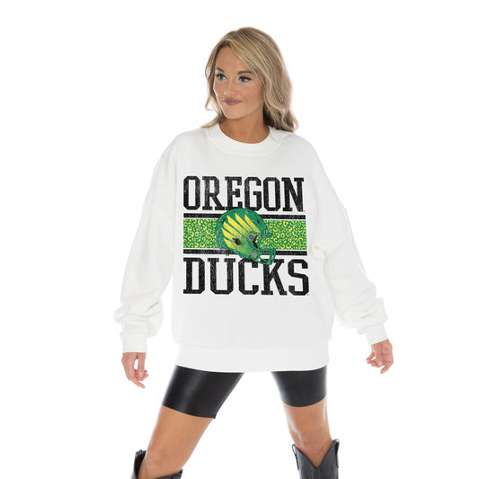 OREGON DUCKS FAIR CATCH LONG SLEEVE UNISEX FIT PREMIUM FLEECE CREWNECK SWEATSHIRT WITH RIBBED KNIT NECKLINE, WRIST, AND WAISTBAND