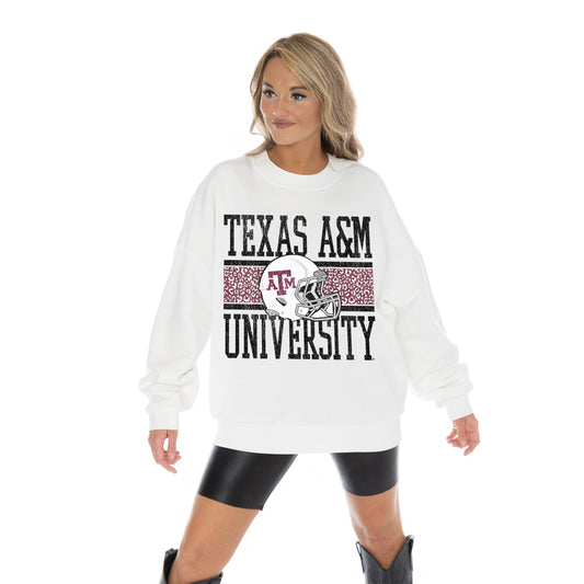 TEXAS A&M AGGIES FAIR CATCH LONG SLEEVE UNISEX FIT PREMIUM FLEECE CREWNECK SWEATSHIRT WITH RIBBED KNIT NECKLINE, WRIST, AND WAISTBAND