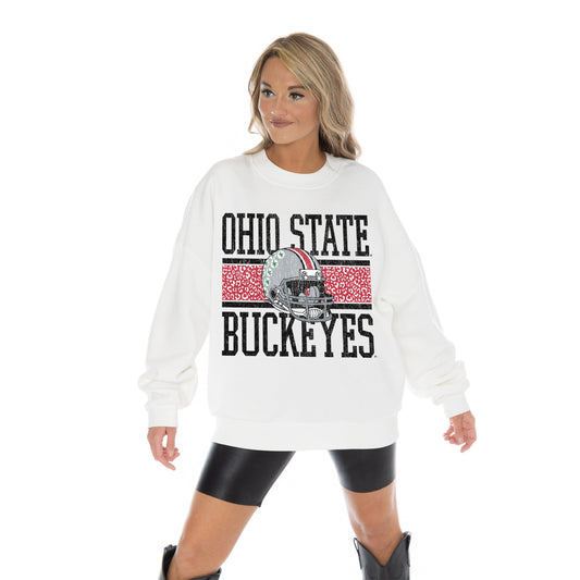OHIO STATE BUCKEYES FAIR CATCH LONG SLEEVE UNISEX FIT PREMIUM FLEECE CREWNECK SWEATSHIRT WITH RIBBED KNIT NECKLINE, WRIST, AND WAISTBAND