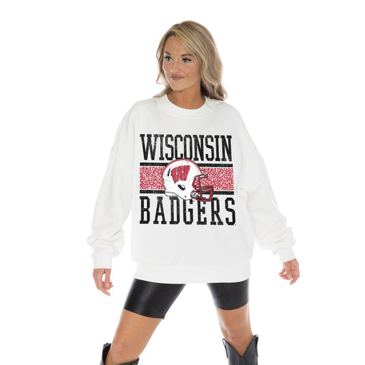 WISCONSIN BADGERS FAIR CATCH LONG SLEEVE UNISEX FIT PREMIUM FLEECE CREWNECK SWEATSHIRT WITH RIBBED KNIT NECKLINE, WRIST, AND WAISTBAND