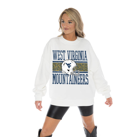 WEST VIRGINIA MOUNTAINEERS FAIR CATCH LONG SLEEVE UNISEX FIT PREMIUM FLEECE CREWNECK SWEATSHIRT WITH RIBBED KNIT NECKLINE, WRIST, AND WAISTBAND