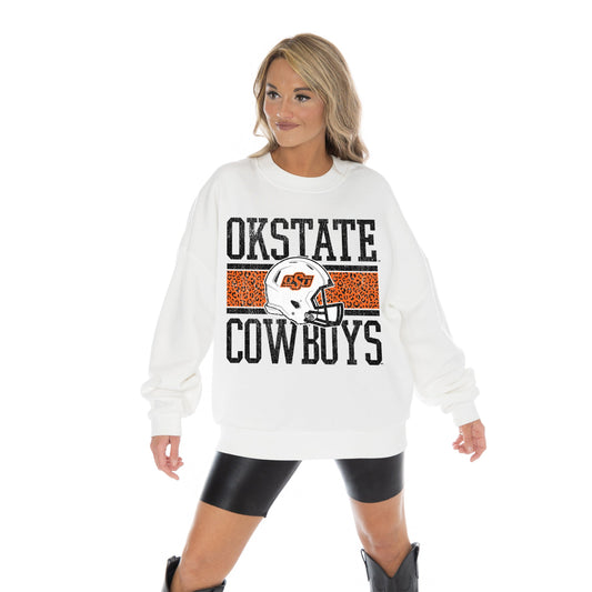 OKLAHOMA STATE COWBOYS FAIR CATCH LONG SLEEVE UNISEX FIT PREMIUM FLEECE CREWNECK SWEATSHIRT WITH RIBBED KNIT NECKLINE, WRIST, AND WAISTBAND