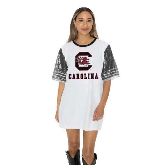 SOUTH CAROLINA GAMECOCKS BLING IT FULL SEQUIN FASHION JERSEY TUNIC DRESS WITH SPORTS STRIPE SLEEVE DETAIL AND LIGHTWEIGHT GARMENT LINING