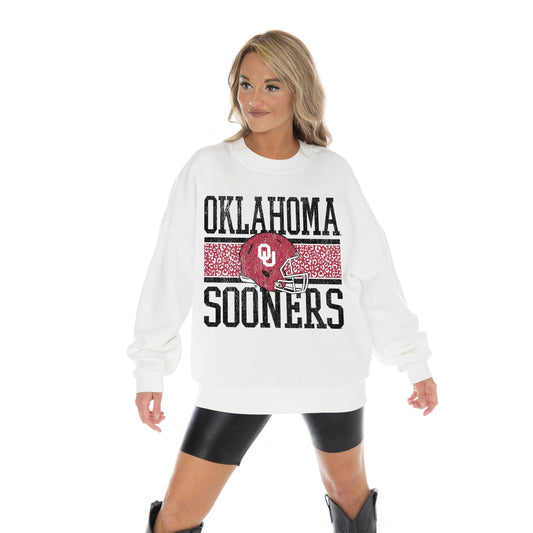 OKLAHOMA SOONERS FAIR CATCH LONG SLEEVE UNISEX FIT PREMIUM FLEECE CREWNECK SWEATSHIRT WITH RIBBED KNIT NECKLINE, WRIST, AND WAISTBAND