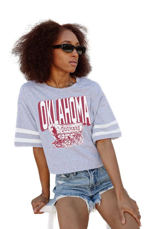 OKLAHOMA SOONERS NO SHORTCUTS DROP SHOULDER MID-CROP TEE
