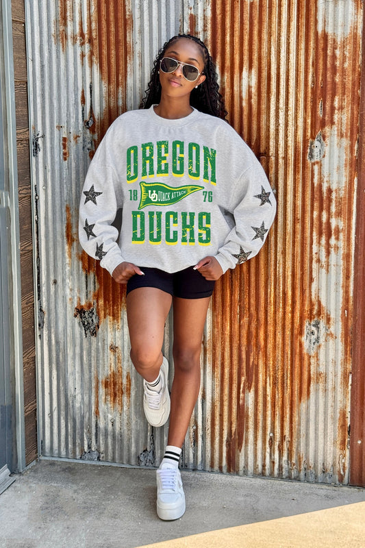 OREGON DUCKS PENNANT PRIDE EMBELLISHED STAR SLEEVE CREWNECK PULLOVER
