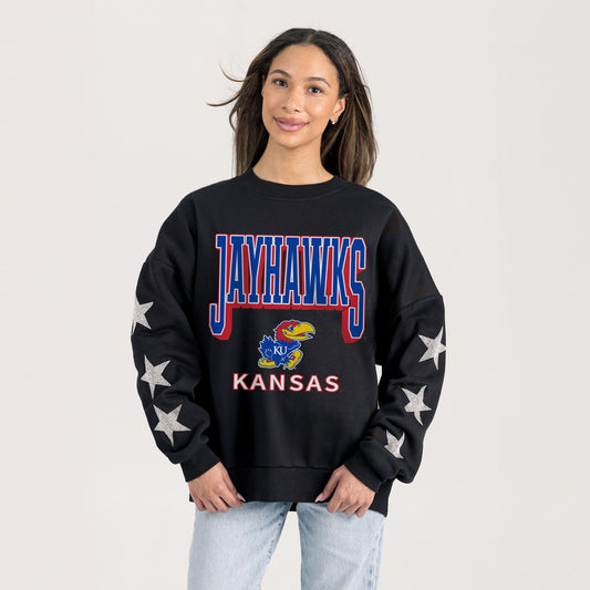 KANSAS JAYHAWKS PURE VICTORY EMBELLISHED STAR SLEEVE CREWNECK PULLOVER