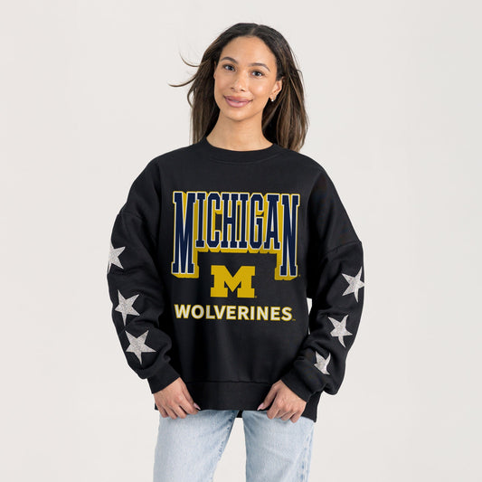 MICHIGAN WOLVERINES PURE VICTORY EMBELLISHED STAR SLEEVE CREWNECK PULLOVER