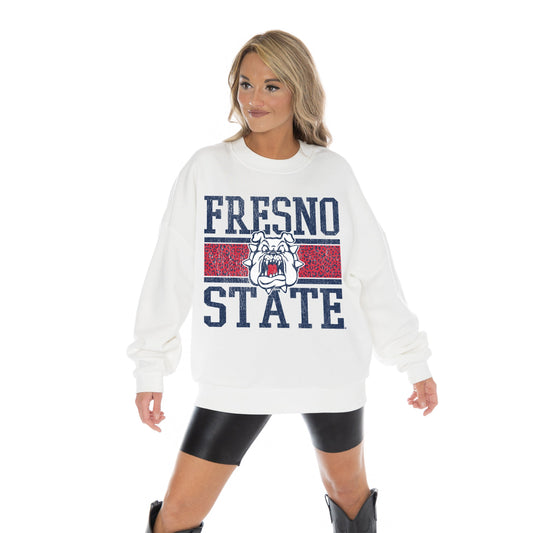 FRESNO STATE BULLDOGS FAIR CATCH LONG SLEEVE UNISEX FIT PREMIUM FLEECE CREWNECK SWEATSHIRT WITH RIBBED KNIT NECKLINE, WRIST, AND WAISTBAND