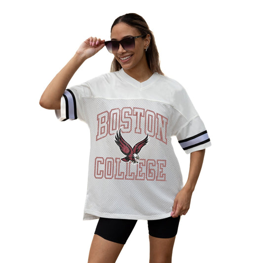 BOSTON COLLEGE EAGLES A STEP AHEAD ICONIC OVERSIZED MESH SHORT SLEEVE V-NECK FASHION JERSEY TOP WITH SIDE SLITS