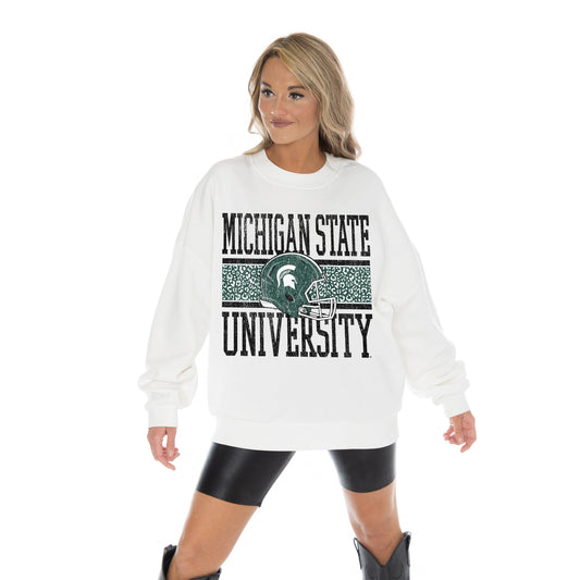 MICHIGAN STATE SPARTANS FAIR CATCH LONG SLEEVE UNISEX FIT PREMIUM FLEECE CREWNECK SWEATSHIRT WITH RIBBED KNIT NECKLINE, WRIST, AND WAISTBAND