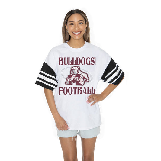 MISSISSIPPI STATE BULLDOGS STARTING LINEUP BOLD CONTRAST, OVERSIZED, SPORTY HERITAGE-STRIPED TEE WITH JERSEY MESH SHORT SLEEVES AND RIBBED NECKLINE